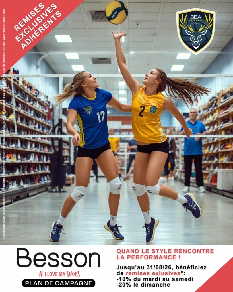 [🔵🟡 Quand le style rencontre la performance] Le Bouc-Bel-Air Volley-Ball est heureux d’annoncer la signature d’un partenariat avec le magasin Besson Chaussures de Plan de Campagne. Dans le cadre de cette collaboration, les adhérents du club pourront bénéficier de remises exclusives valables jusqu’au 31 août 2026 : -10 % de réduction du mardi au samedi et -20 % de réduction le dimanche.